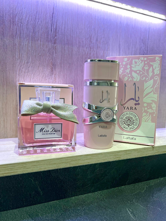 DÚO PERFUMES ( Yara Rosa + Miss Dior ) + Regalo Perfumero 🎁