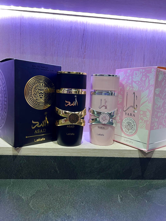 DÚO PERFUMES PAREJA ( Asad + Yara Rosa ) + Regalo Perfumero 🎁