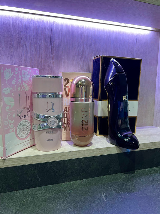 TRÍO PERFUMES ( Yara Rosa + 212 VIP Rosé + Good Girl ) + Regalo Perfumero 🎁