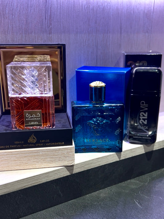 TRÍO PERFUMES ( Eros Versace + Khamrah + 212 VIP Black ) + Regalo Perfumero 🎁