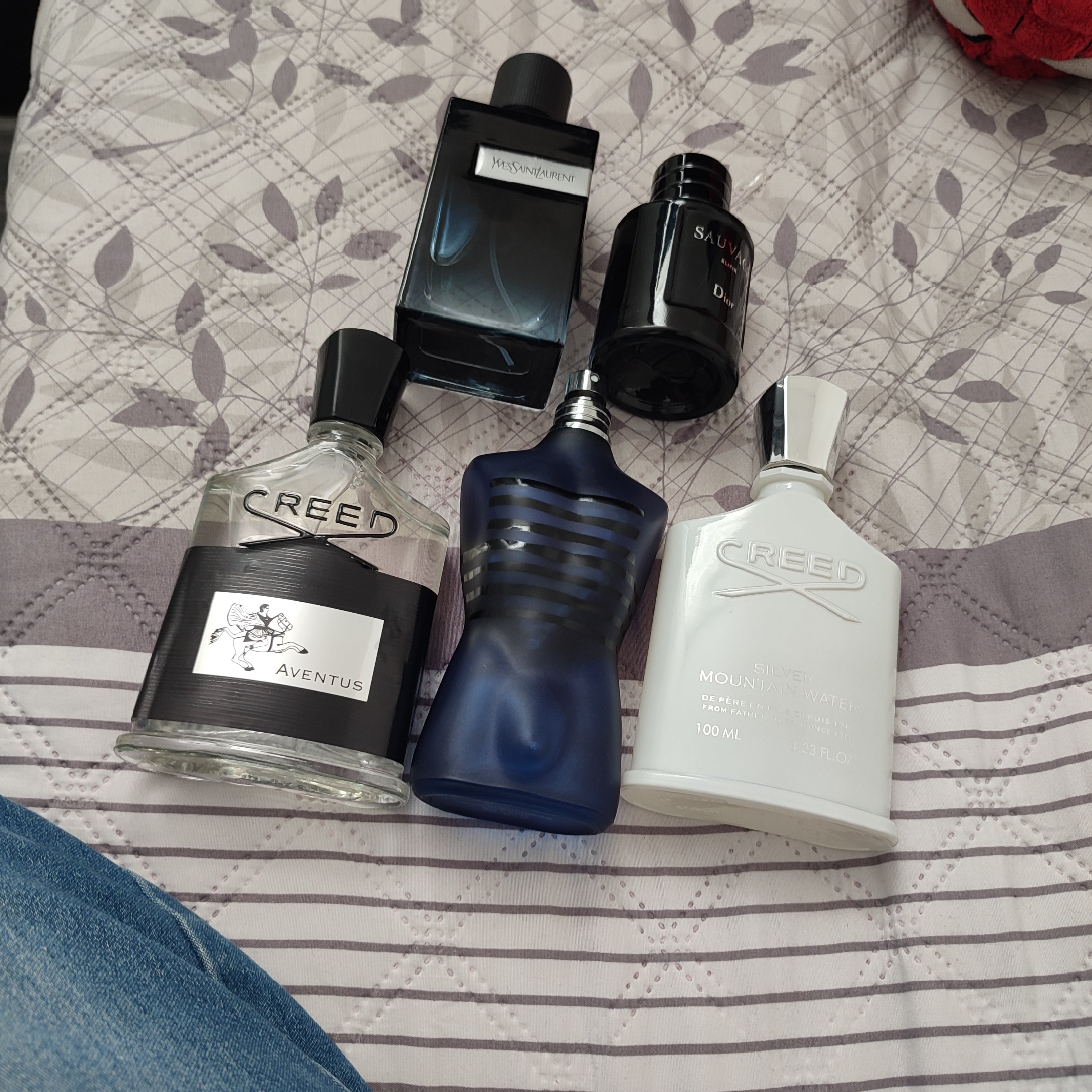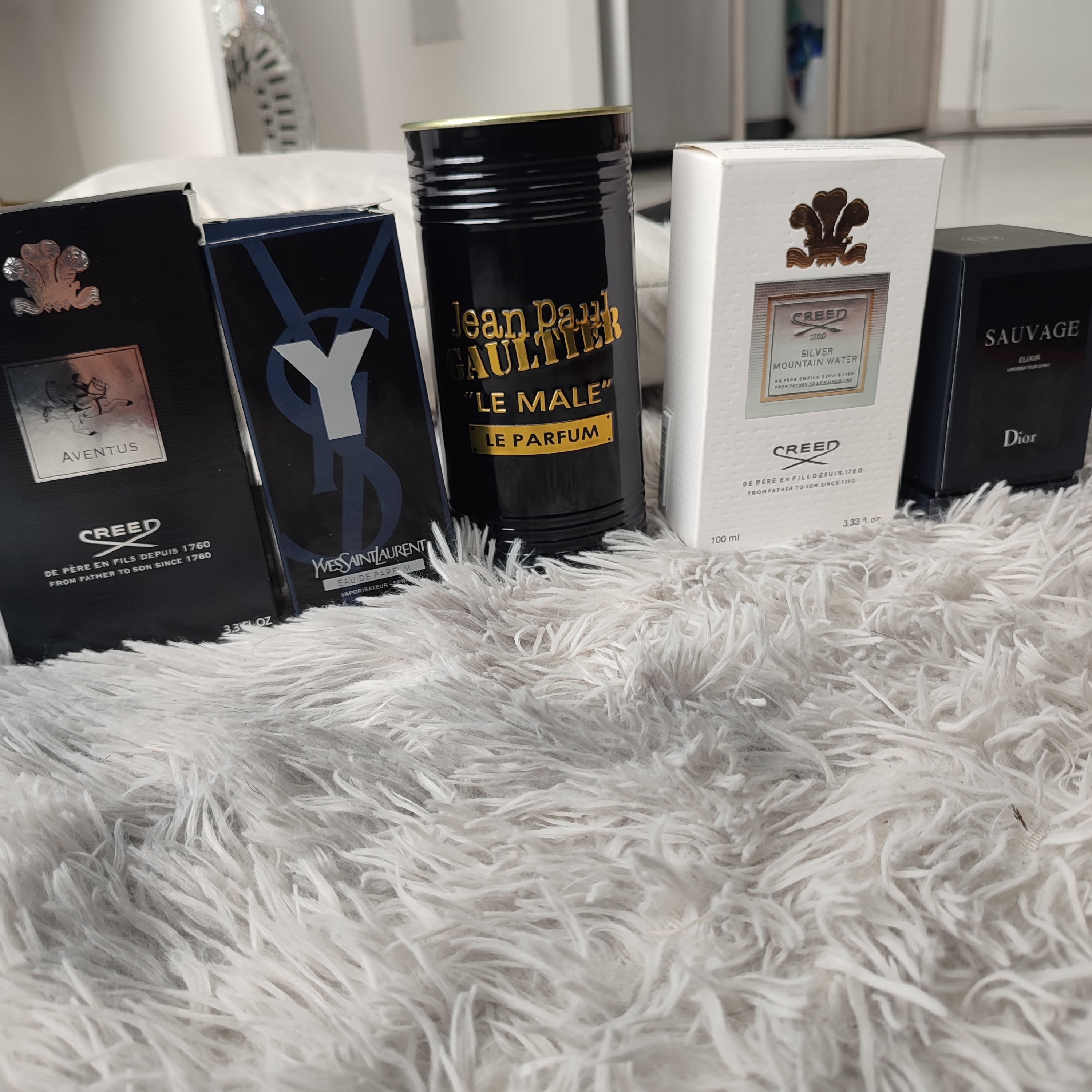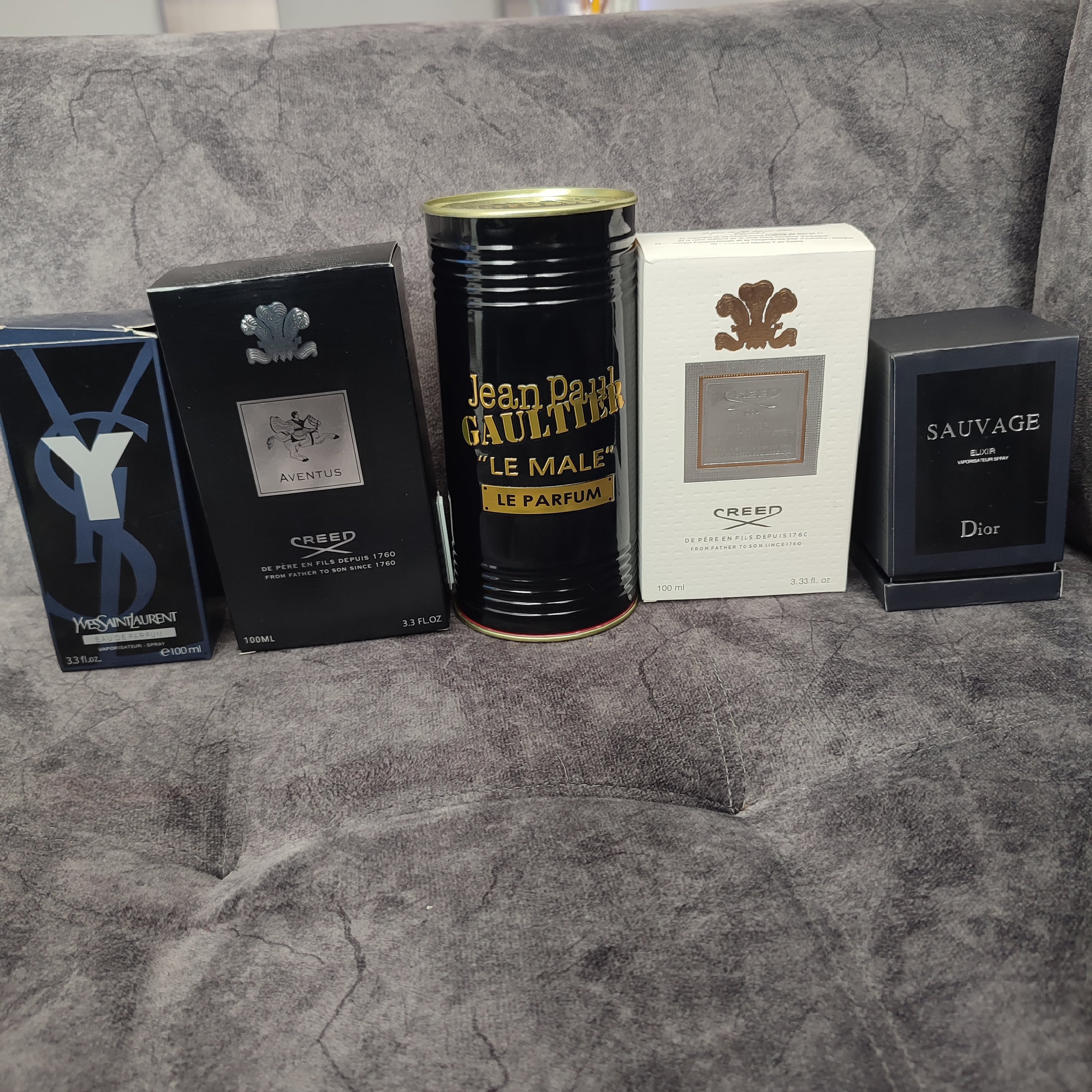 5 PERFUMES + 1 OBSEQUIO ( Y YSL + JPG le male + creed aventus + creed mountain water + sauvage elixir + 1 Perfumero )