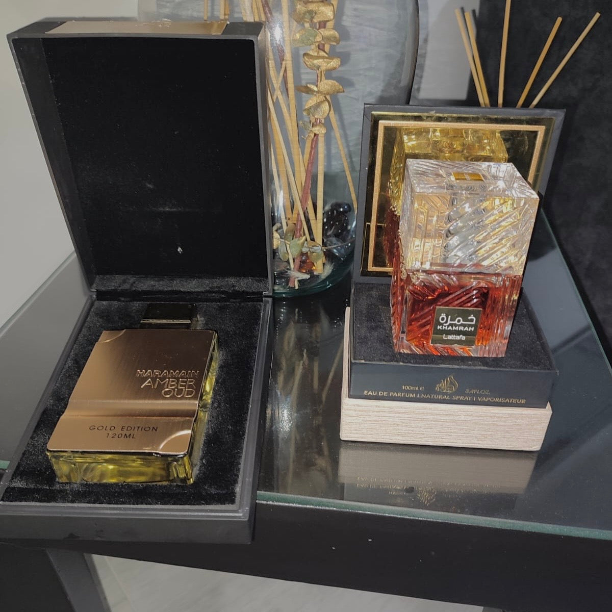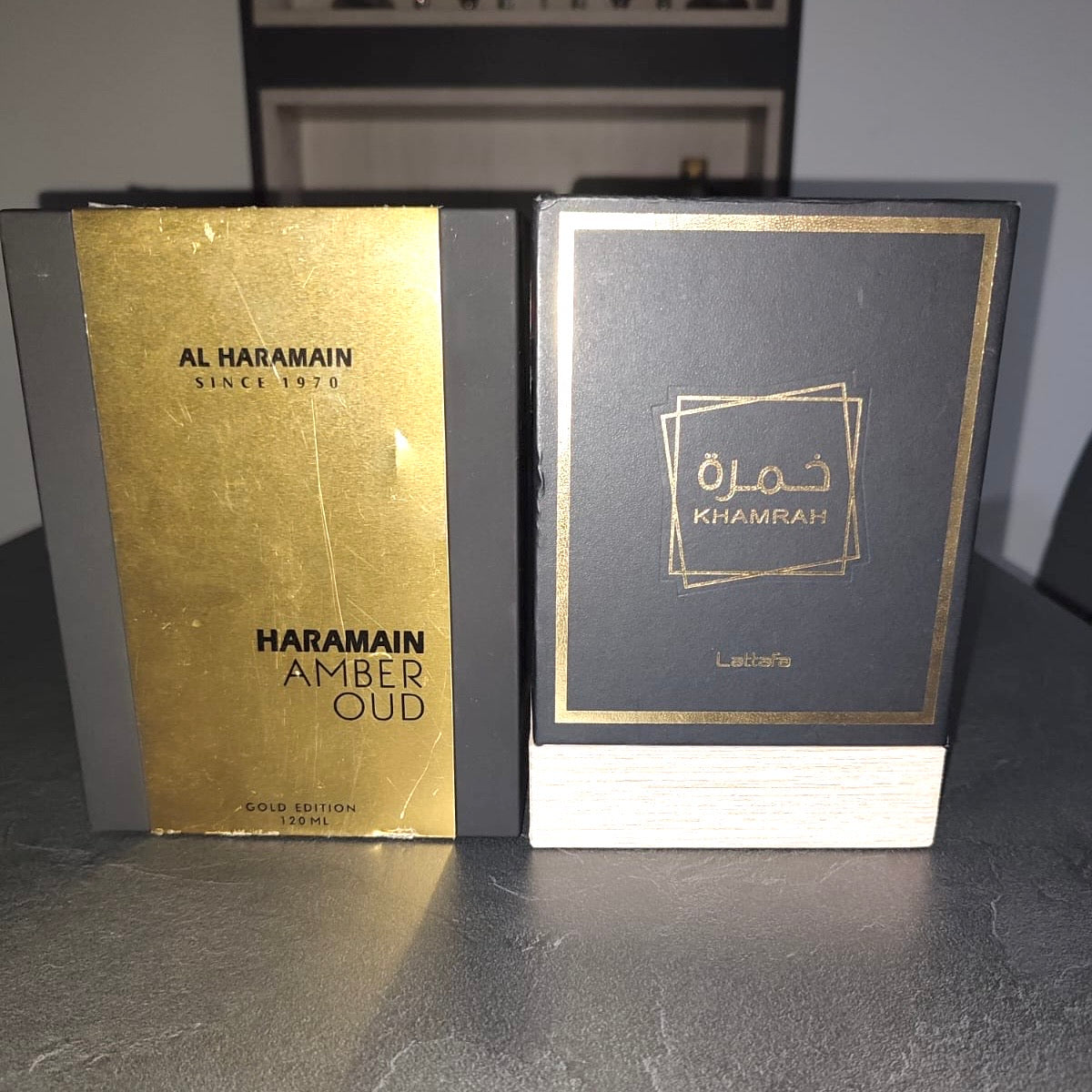 DÚO PERFUMES ( Haramain Oud Gold + Khamrah ) + Regalo Perfumero